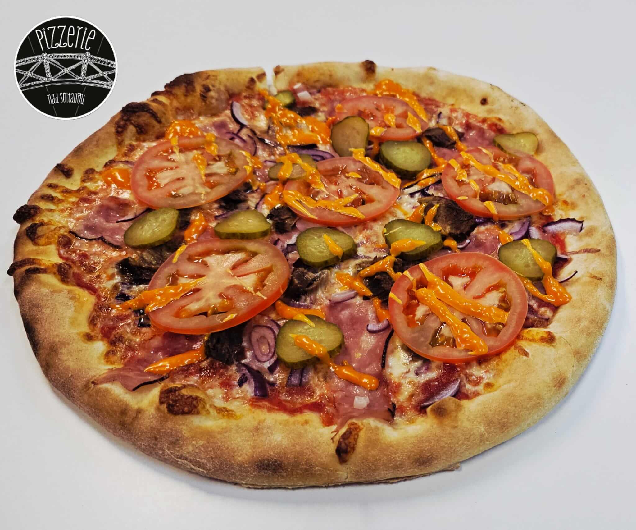 Pomodoro, Mozzarella, Cheddar, Slanina, Šunka, Čabajka, Cibule, Jalapeňo